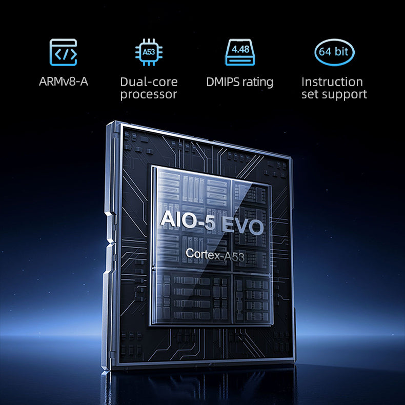 AIO-5 EVOは、デュアルコアCortex-A53(ARMv8-A)プラットフォームを採用し、64ビット処理によってBSDやライディングデータ、マルチタスクが常にスムーズかつ安定して動作します。