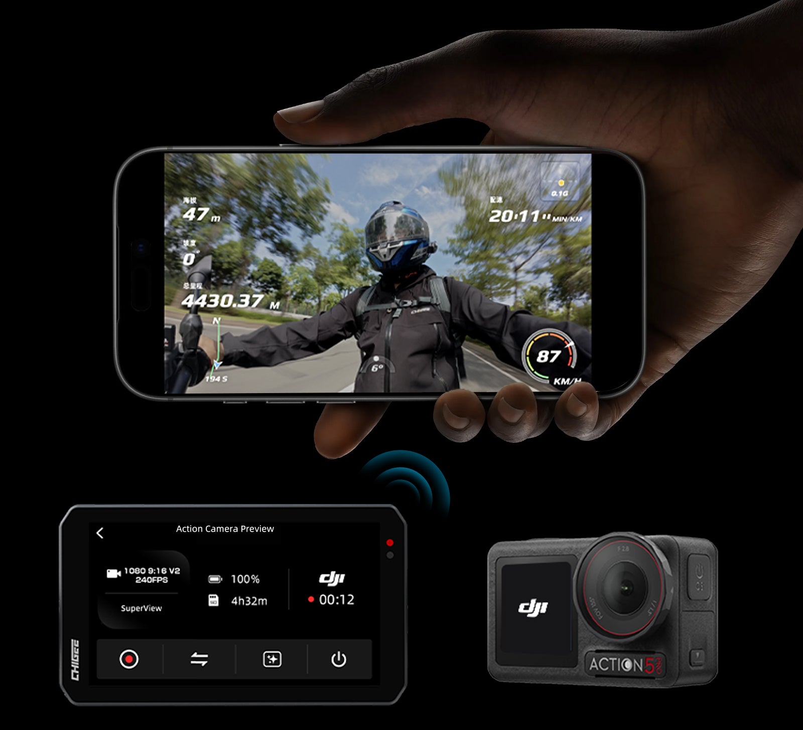 CHIGEE Goアプリを使えば、わずか数回のタップでライドの映像をプレビューおよびダウンロードできます。5 GHz Wi-Fiの高速転送により、大容量の動画ファイルも素早く移動できるので、ケーブルを使わずに、クリップを簡単に保存・共有・アーカイブできます。