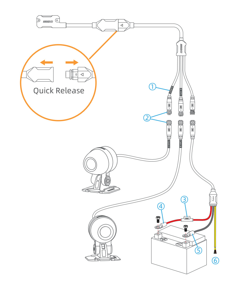 เชื่อมต่อสายปล่อยเร็วของกล้องเข้ากับกล้องด้านหน้า/ด้านหลังและแบตเตอรี่รถจักรยานยนต์